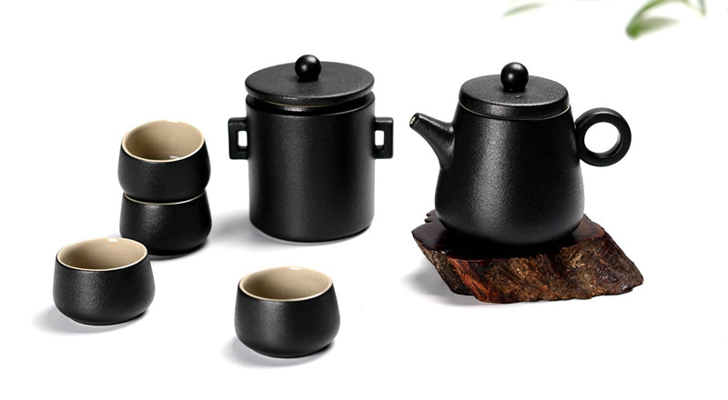 本系列采用天然陶土,多道工序窯火淬煉,燒成溫度1250度以上。胎體質(zhì)密,安全環(huán)保,內(nèi)釉光潔易清洗。造型簡(jiǎn)練雅致,一壺一罐四杯,表面黑色且?guī)е暗[般粗糙的釉面有一種質(zhì)樸的生活美學(xué)觀感。其氣質(zhì)與茶道美學(xué)文化相得益彰,是一件給以給家中加分的陶制器物。